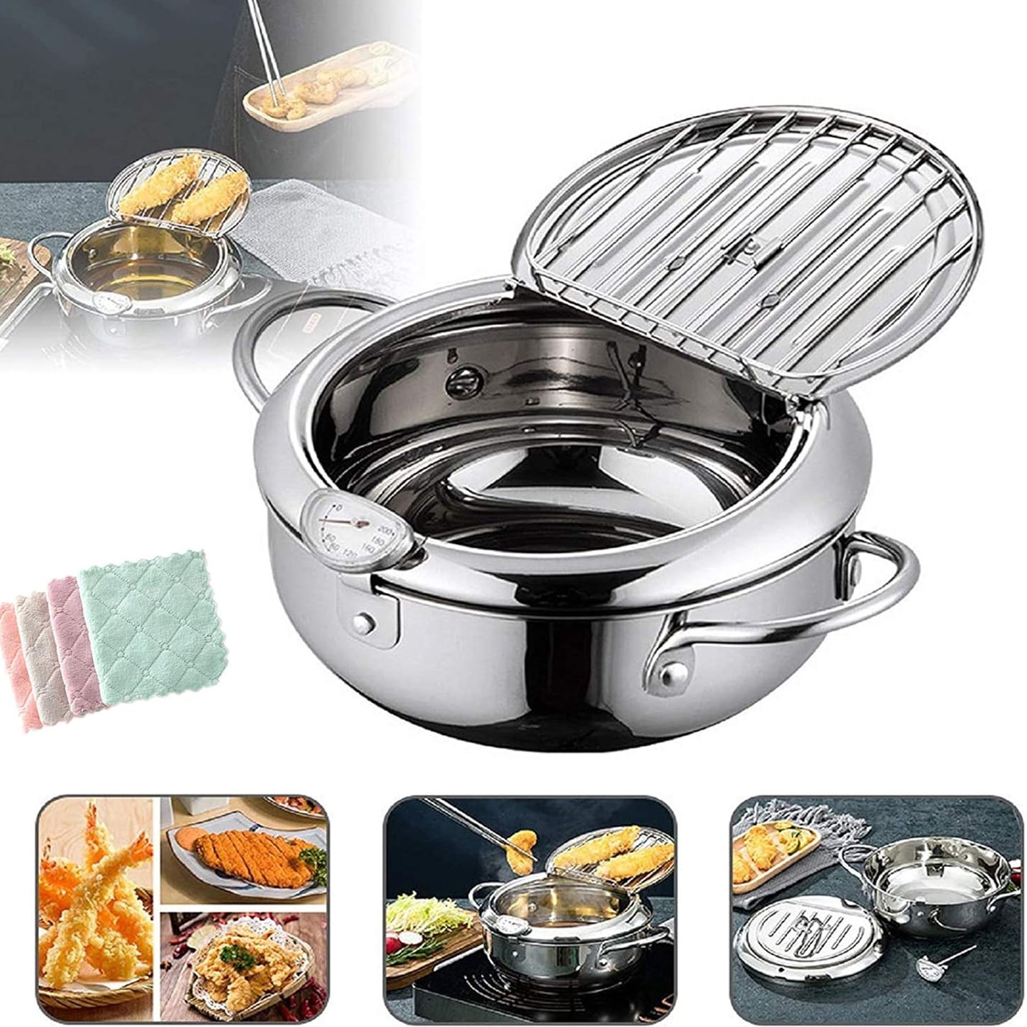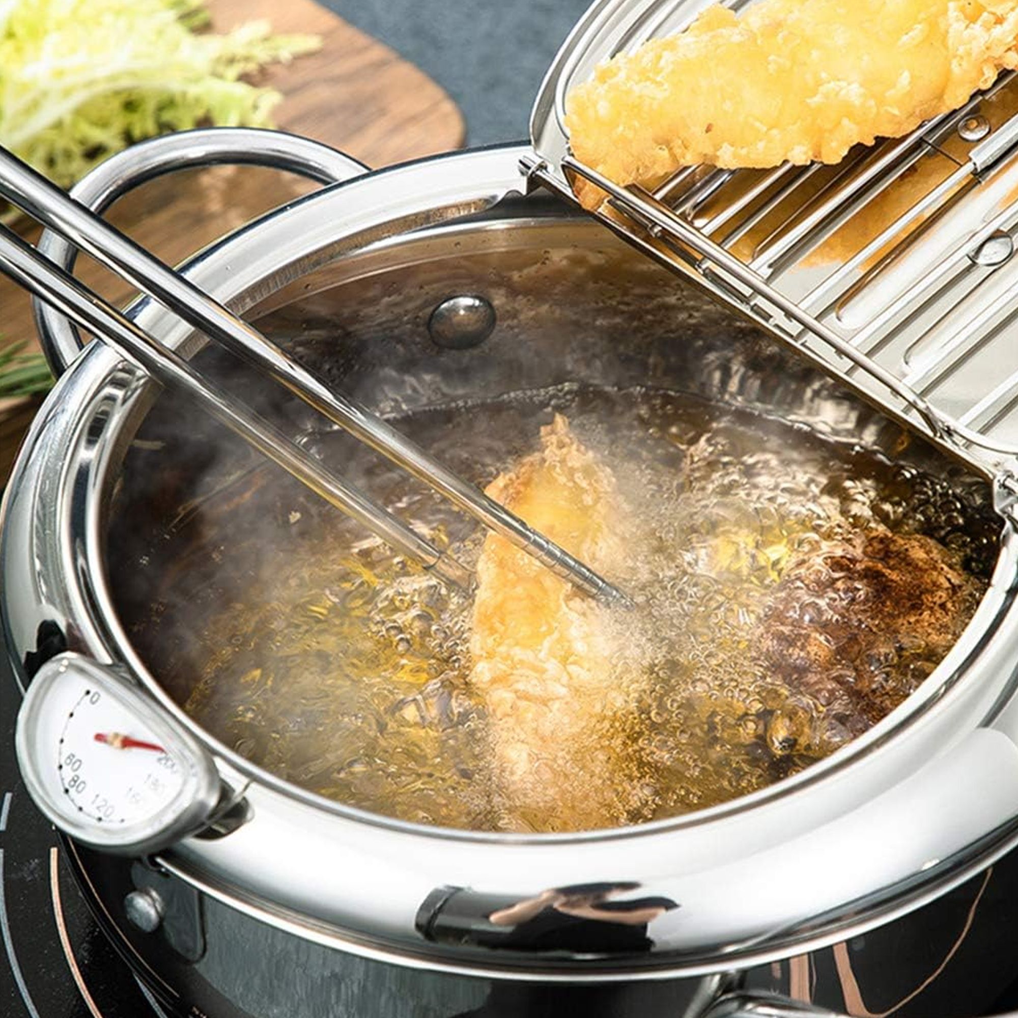 الغطاء المائل يقيك من تناثر الزيت طول ما أنت تقلي، مما يجعل تجربة الطبخ أكثر أمانًا.